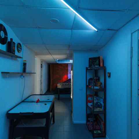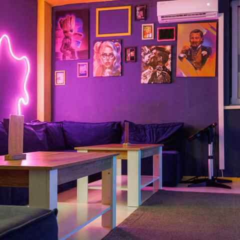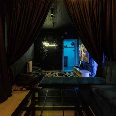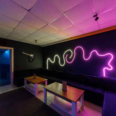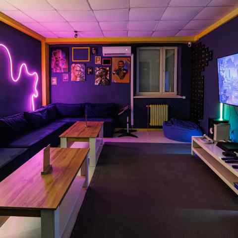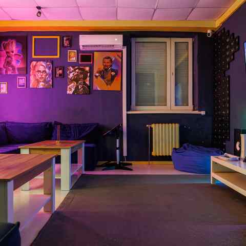 Вместительная и светлая, идеально подойдёт для дружеских встреч. Мягкие диваны, кресла, большой экран, неоновые детали и атмосфера тепла. Под рукой — всё для танцев, игр и хорошего вечера: PlayStation, VR, караоке, настольные игры и RockBand.