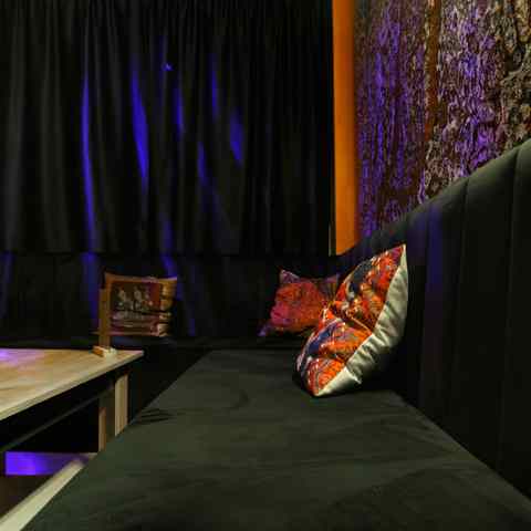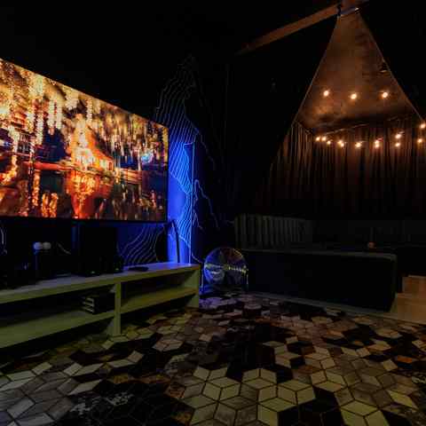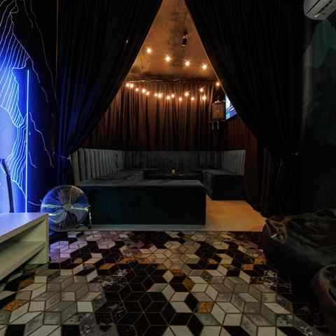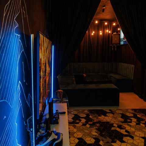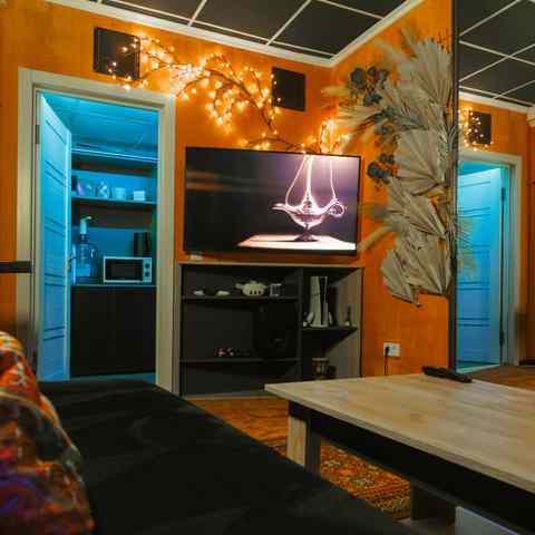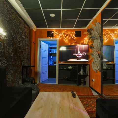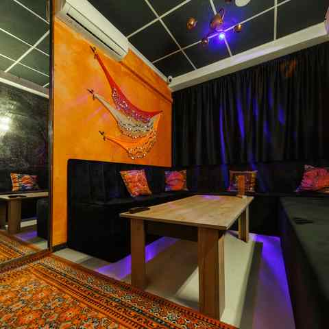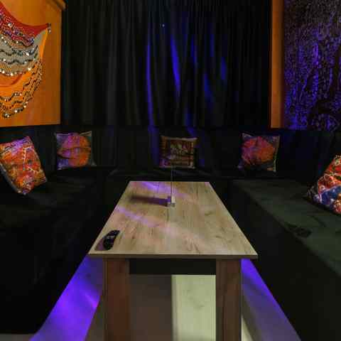 Небольшое, камерное пространство с мягким светом, тёплыми оттенками и восточными элементами в интерьере. Подойдёт для тех, кто ценит атмосферу и уединение. В наличии — всё, что нужно для вечеринки или уютного вечера: игры, танцы, караоке и фотозона.