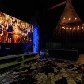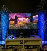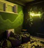 Интерьер вдохновлён природными мотивами. Комната разделена на две зоны: одна для караоке с мягким светом, другая — игровая, с большим экраном, пуфами и консолями. Здесь можно сменять активные игры на спокойное общение и наоборот.