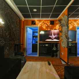 Небольшое, камерное пространство с мягким светом, тёплыми оттенками и восточными элементами в интерьере. Подойдёт для тех, кто ценит атмосферу и уединение. В наличии — всё, что нужно для вечеринки или уютного вечера: игры, танцы, караоке и фотозона.